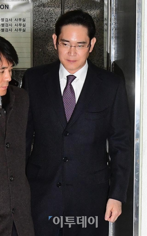 뇌물공여와 횡령 등의 혐의로 구속영장이 청구된 이재용 삼성전자 부회장이 영장실질심사에 앞서 18일 오전 서울 대치동 특별검사 사무실에 출석한 뒤 특검팀 검사 등과 함께 서울중앙지법으로 향하고 있다. 고이란 기자 photoeran@