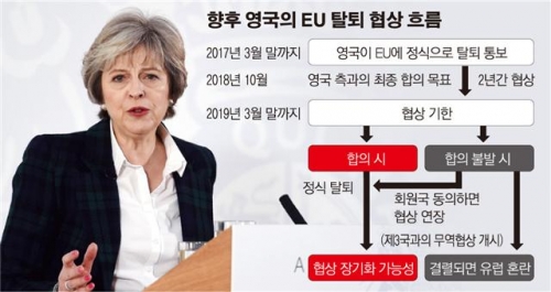 하지만 순 협상 기간만 1년 반 정도로 예상되는 등 긴 시간이 걸린다. EU 측 협상 책임자인 EU 집행위원회(EC)의 미셸 바르니에 수석 협상관은 영국 측과의 최종 합의 시기를 2018년 10월로 내다봤다. EU와 영국 양측 의회 승인 절차에만 반년 정도가 걸린다는 이유에서다. 이 과정에서 영국과 EU는 영국에 사는 EU 시민과 EU 역내에 사는 영국 국민의 대우 등을 정하는 탈퇴 협정을 논의한다. 그와 동시에 EU 탈퇴 후 영국과 EU의 무역·통상 관계 등에 관한 협상도 추진해야 한다.