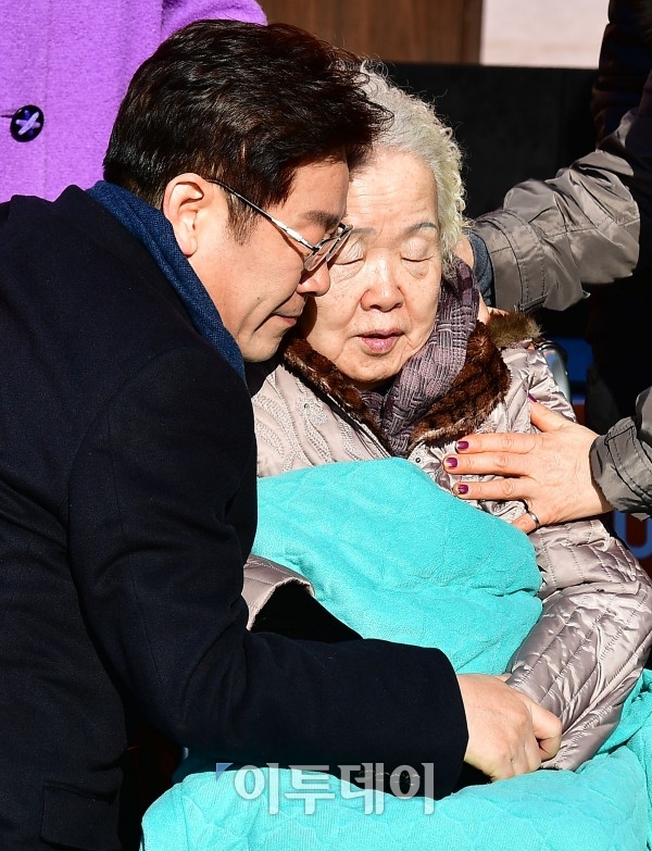 이재명 성남시장이 23일 경기 성남시 오리엔트 시계공장에서 19대 대통령 선거 출마선언에 앞서 어머니를 안아주고 있다. 이동근 기자 foto@