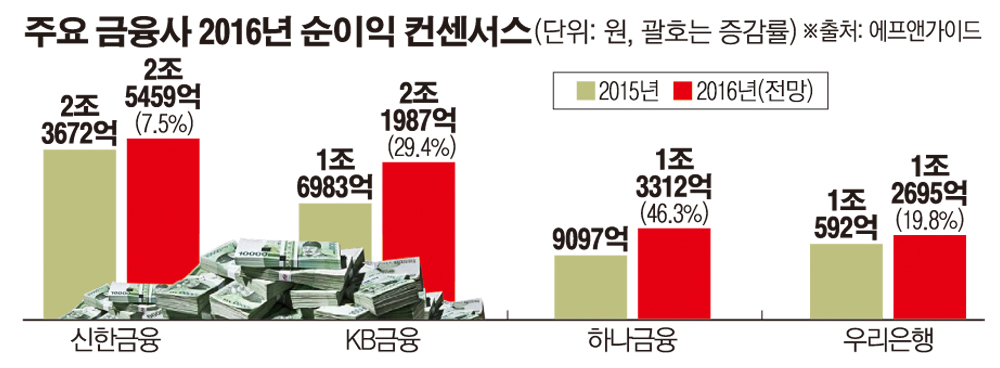 KB금융은 2011년 이후 5년 만에 순이익 2조 클럽에 재진입할 전망이다. KB금융의 작년 순이익 컨센서스는 2조1987억 원으로 2015년 실적 대비 29.4% 늘었다.