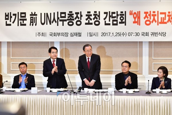반기문 전 UN사무총장 (가운데)이 25일 오전 서울 여의도 국회 귀빈식당에서 열린 '왜 정치교체인가' 초청간담회에 참석해 내빈에게 인사하고 있다. 이동근 기자 foto@