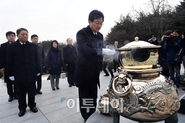 바른정당 대권주자 유승민 의원이 7일 오전 서울 동작구 국립현충원을 찾아 박정희 전 대통령 묘소를 참배하고 있다. 고이란 기자 photoeran@