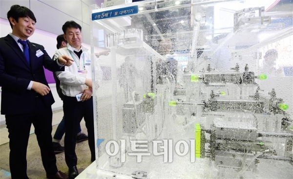 2017 세미콘 코리아가 8일 서울 삼성동 코엑스에서 개막한 가운데 참가자가 전시품을 설명하고 있다. 올해 30회를 맞은 이번 행사에는 역대 최대 규모인 1893개 부스가 참가하며 반도체 산업장비, 재료, 부품, 설계, 소프트웨어, 설비 등 500여개 관련업체가 참여한다. 고이란 기자 photoeran@