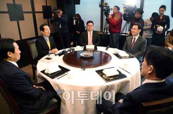 정세균 국회의장(가운데)이 13일 오후 서울 여의도 한 식당에서 2월 임시국회에서 다룰 쟁점법안 처리 방안을 논의하기 위해 여야4당 원내대표들과 만나 모두발언을 하고 있다. 이동근 기자 foto@