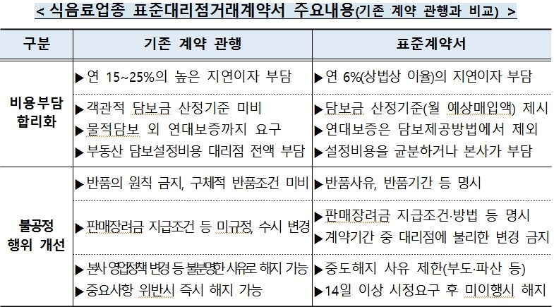 이에 따라 공정위는 식음료업종부터 본사와 대리점 간 거래조건이 균형있게 설정된 표준계약서를 개정해 보급하게 됐다고 설명했다.