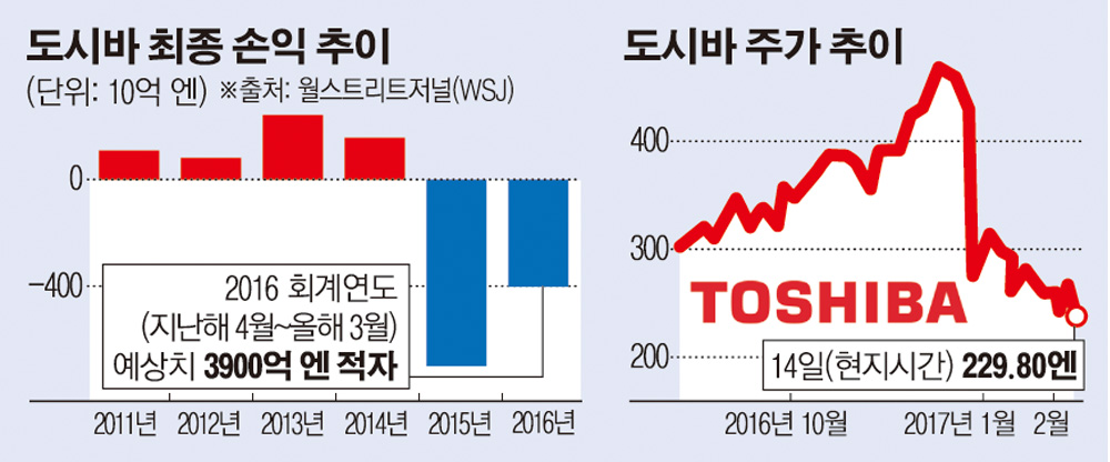 14일(현지시간) 도시바는 원래 이날로 예정됐던 2016 회계연도 3분기(2016년 4~12월)까지의 실적 발표를 갑자기 1개월 연기한다고 발표했다. 도시바는 미국 원전 자회사인 웨스팅하우스(WH)의 막대한 손실로 거액의 적자가 불가피한 상황. 이날 도시바는 미국 원전사업 손실 7125억 엔(약 7조1486억 원)을 상각 처리한다며 이에 지난해 4~12월 최종 4999억 엔의 적자를 냈다고 밝혔다. 지난해 12월 말 기준 자기자본은 1912억 엔 마이너스(-)로 실질적으로 채무초과 상태에 빠졌다. 자기자본 잠식으로 사실상 파산 일보 직전 상태가 된 것이다.