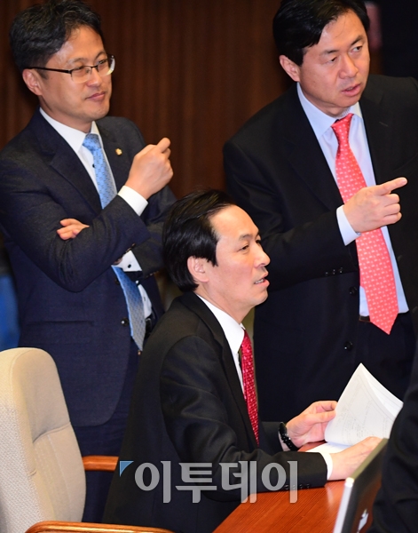 우상호 더불어민주당 원내대표(가운데)가 23일 서울 여의도 국회에서 열린 제349회 국회(임시회) 제8차 본회의에서 투표현황을 보고 있다. 고이란 기자 photoeran@