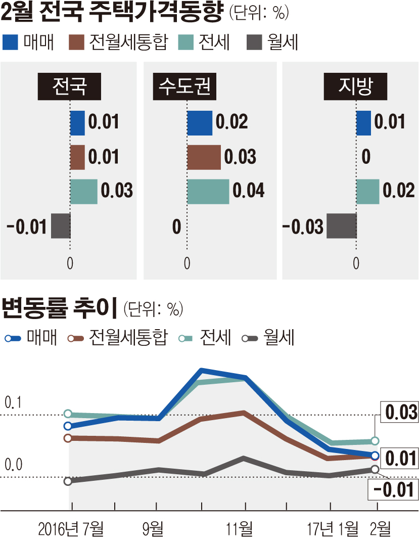한국감정원이 2월 전국주택가격동향조사를 실시한 결과 지난달 대비(1월 9일 대비 2월 13일 기준) 매매가격은 0.01% 상승, 전월세통합은 0.01% 상승, 전세가격은 0.03% 상승, 월세가격은 0.01% 하락을 기록한 것으로 나타났다.