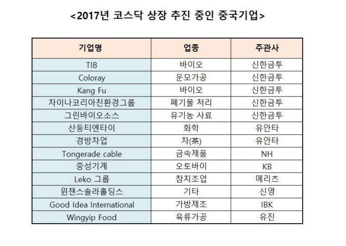 6일 금융투자업계에 따르면 올해 국내 코스닥 시장 상장 추진 중인 중국기업은 차이나코리아친환경그룹, 그린바이오소스, 산둥티엔타이, 경방차업, 윈챈스솔라홀딩스 등 무려 13곳에 달한다. 현재 한국 증시에 상장돼 있는 중국기업 수가 총 15개(코스피 1곳ㆍ코스닥 14곳)임을 감안하면, 올 한 해만 상당히 많은 기업들이 몰리는 셈이다.