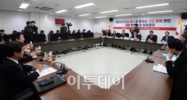 정우택 자유한국당 원내대표가 7일 오전 서울 여의도 국회에서 열린 '북한의 미사일 발사 및 중국의 사드 보복 관련 대응 방안 논의 당정협의'에서 모두발언을 하고 있다. 고이란 기자 photoeran@