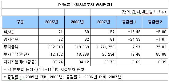 KRX에 따르면 올해 신규시설투자 회사수 및 공시건수는 전년동기 대비 각각 5.00%, 1.61% 감소했음에도 불구하고, 전체 투자금액은 전년동기 8200억원에서 1조4418억원으로 75.83% 증가했다.