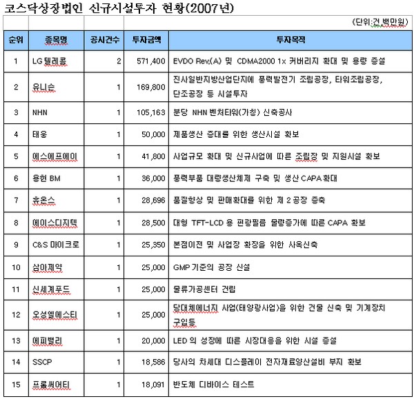 한편 EVDO Rev.(A) 및 CDMA2000 1x 커버리지 확대 및 용량 증설에 5714억원을 투자한 LG텔레콤이 투자금액 기준 1위에 올랐으며, 진사일반지방산업단지에 풍력발전기 조립공장, 타워조립공장, 단조공장 등 시설투자에 1698억원을 투자한 유니슨이 2위에 올랐고, 분당 NHN벤처타워(가칭) 신축공사에 1051억6300만원을 들인 NHN이 그 뒤를 이었다.