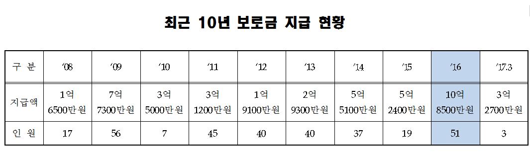 보로금 지급액은 특히 박근혜 정부에서 증가 추세이다. 이명박 정부에선 2008년 17명에 1억6500만 원을 시작으로, 이듬해 56명에 7억7300만 원까지 지급했다가 2012년 40명에 1억9100만 원을 지급하는 데 그쳤다. 5년 동안의 총지급액은 165명에 17억9100만 원이었다.