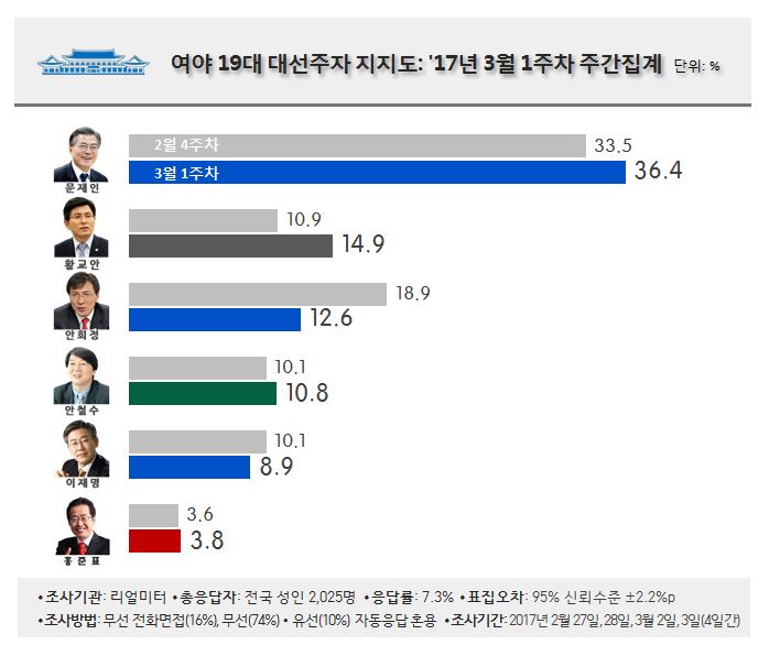 문 전 대표의 지지율은 지난주 33.5%에서 2.9%포인트 오른 36.4%, 황 대행은 10.9%에서 4.0%포인트 오른 14.9%, 안 지사는 18.9%에서 6.3%포인트 내린 12.6%를 기록했다. 이어 국민의당 안철수 전 대표가 0.7%포인트 올라 10.8%, 민주당 소속 이재명 성남시장이 1.2%포인트 내린 8.9%였고, 자유한국당 복당이 예상되는 홍준표 경남지사가 0.2%포인트 오른 3.8%로 6위를 차지했다.
