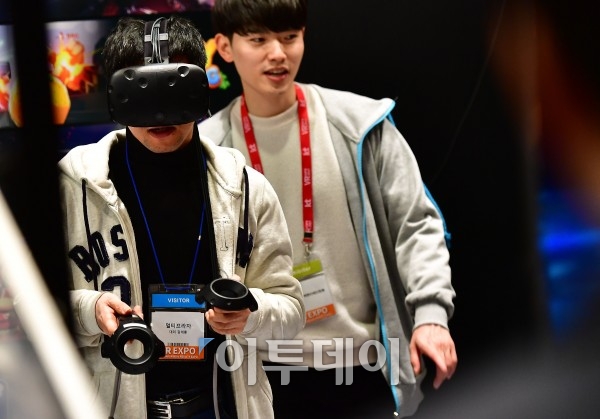 VR EXPO 2017이 9일 서울 강남구 코엑스에서 열린 가운데 한 관람객이 VR 체험을 하고 있다. 국내 최초로 열린 이번 전시는 오는 11일까지 열리며, 40여개의 VR 업체들의 콘텐츠, 플랫폼, 하드웨어는 와 게임, 영상, 의료, 마케팅 네 분야의 전문가들의 강연이 열릴 예정이다. 이동근 기자 foto@
