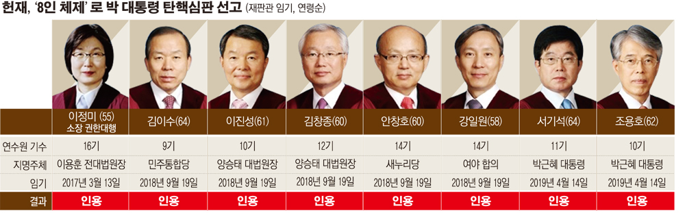 재판부는 끝으로 “결국 박 대통령의 행위는 헌법수호의 관점에서 용납될 수 없는 중대한 법 위배행위라고 봐야 한다”며 “헌법질서에 미치는 부정적 영향과 파급효과가 중대하므로, 박 대통령을 파면함으로써 얻는 헌법 수호의 이익이 압도적으로 크다고 할 것”이라고 선언했다.