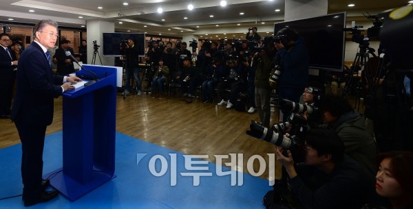박근혜 전 대통령이 파면되며 본격적인 조기 대선 국면으로 접어든 가운데 문재인 전 더불어민주당 대표가 12일 서울 여의도 당사에서 기자회견을 열고 박 전 대통령 탄핵에 대한 입장을 밝히고 있다. 이동근 기자 foto@