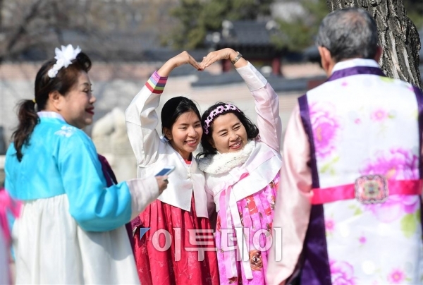 중국 정부의 사드(고고도미사일방어체계) 보복으로 한국을 찾는 중국인 관광객들이 줄고 있는 반면 동남아 관광객들은 증가해 주목받고 있다. 관광업계에 따르면 지난해 한국을 찾은 동남아 관광객은 총 221만여명으로 전년대비 37.7% 증가한 것으로 나타났다. 13일 서울 종로구 경복궁을 찾은 동남아 관광객들이 손으로 하트를 만들고 있다. 고이란 기자 photoeran@