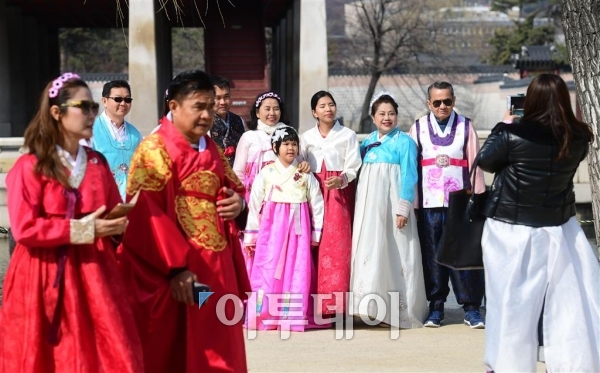 중국 정부의 사드(고고도미사일방어체계) 보복으로 한국을 찾는 중국인 관광객들이 줄고 있는 반면 동남아 관광객들은 증가해 주목받고 있다. 관광업계에 따르면 지난해 한국을 찾은 동남아 관광객은 총 221만여명으로 전년대비 37.7% 증가한 것으로 나타났다. 13일 서울 종로구 경복궁을 찾은 동남아 관광객들이 한복을 입고 기념촬영을 하고 있다. 고이란 기자 photoeran@
