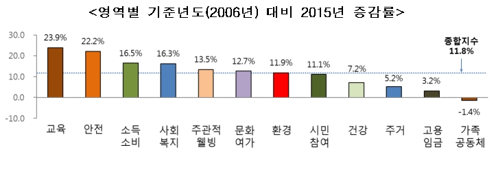 지난 10년 간 영역 종합지수 증가율을 보면 교육(23.9%), 안전(22.2%), 소득·소비(16.5%), 사회복지(16.3%) 영역은 종합지수의 개선을 견인한 반면, 가족ㆍ공동체(-1.4%), 고용ㆍ임금(3.2%), 주거(5.2%), 건강(7.2%) 영역은 전체 종합지수보다 낮은 증가율을 기록했다.
