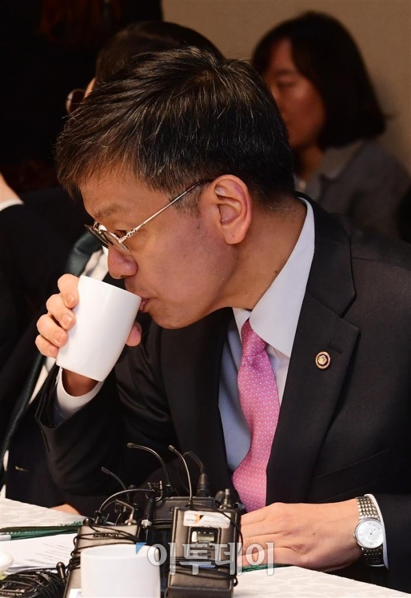 최상목 기획재정부 제1차관이 16일 오전 서울 세종대로 정부서울청사에서 열린 제51차 거시경제금융회의에서 물을 마시고 있다. 이 자리에서 최 차관은 "미국의 금리인상으로 시장 변동성 확대가 예상된다"며 "적기에 시장 안정화를 위한 조치를 추진하겠다"고 밝혔다. 고이란 기자 photoeran@