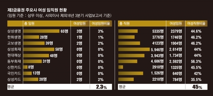 삼성화재는 전체 임원 58명, 신한카드는 임원 8명 모두 남자였다. 현대해상도 전 임원 48명, 동부화재 31명, 국민카드도 13명 중 여자는 한 명도 없었다.