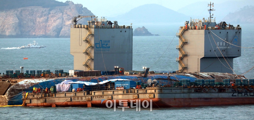 상하이샐비지 선원들이 23일 오후 세월호 침몰 해역인 전남 진도 동거차도 앞바다에서 야간 인양작업을 준비하고 있다. 사진공동취재단