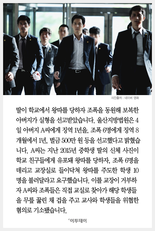 왕따를 당한 딸의 학교에 조폭과 찾아가 위협해 징역 1년을 선고받은 아버지 A씨에 대해 재판부는 "딸이 왕따를 당해 격분했다 해도 조폭을 동원해 교사를 능욕하고 학생들을 위협했다"며 "피해 학생들은 아직도 당시 일을 떠올리면 눈물을 흘리는 등 지울 수 없는 상처를 줬다"고 양형 이유를 밝혔습니다.