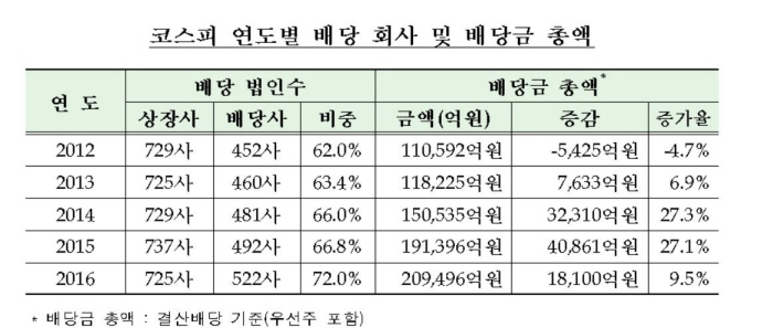 11일 한국거래소가 2012년부터 유가증권시장 12월 결산 법인의 최근 5년간 현금배당 공시를 분석한 결과, 지난해에는 전체 상장법인의 72%(522사)가 현금배당을 실시해 5년 만에 10%포인트 증가했다. 배당금 총액 규모도 꾸준히 증가해 2016년은 20조원을 돌파했다.