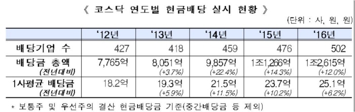 거래소 코스닥시장본부에 따르면 배당실시 기업 502사 중 57.2%(287사)가 5년 연속 배당을 실시했으며 지난해 배당금 총액은 1조2615억 원을 기록했다.