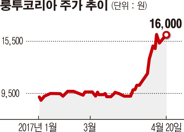 이같은 소식이 시장에 알려진 지난 18일 룽투코리아는 전 거래일 대비 10.27% 오른 1만6100원을 기록하며 52주 신고가를 경신했다. 이는 2015년 9월 17일 종가 1만6850원 이후 최고가다.