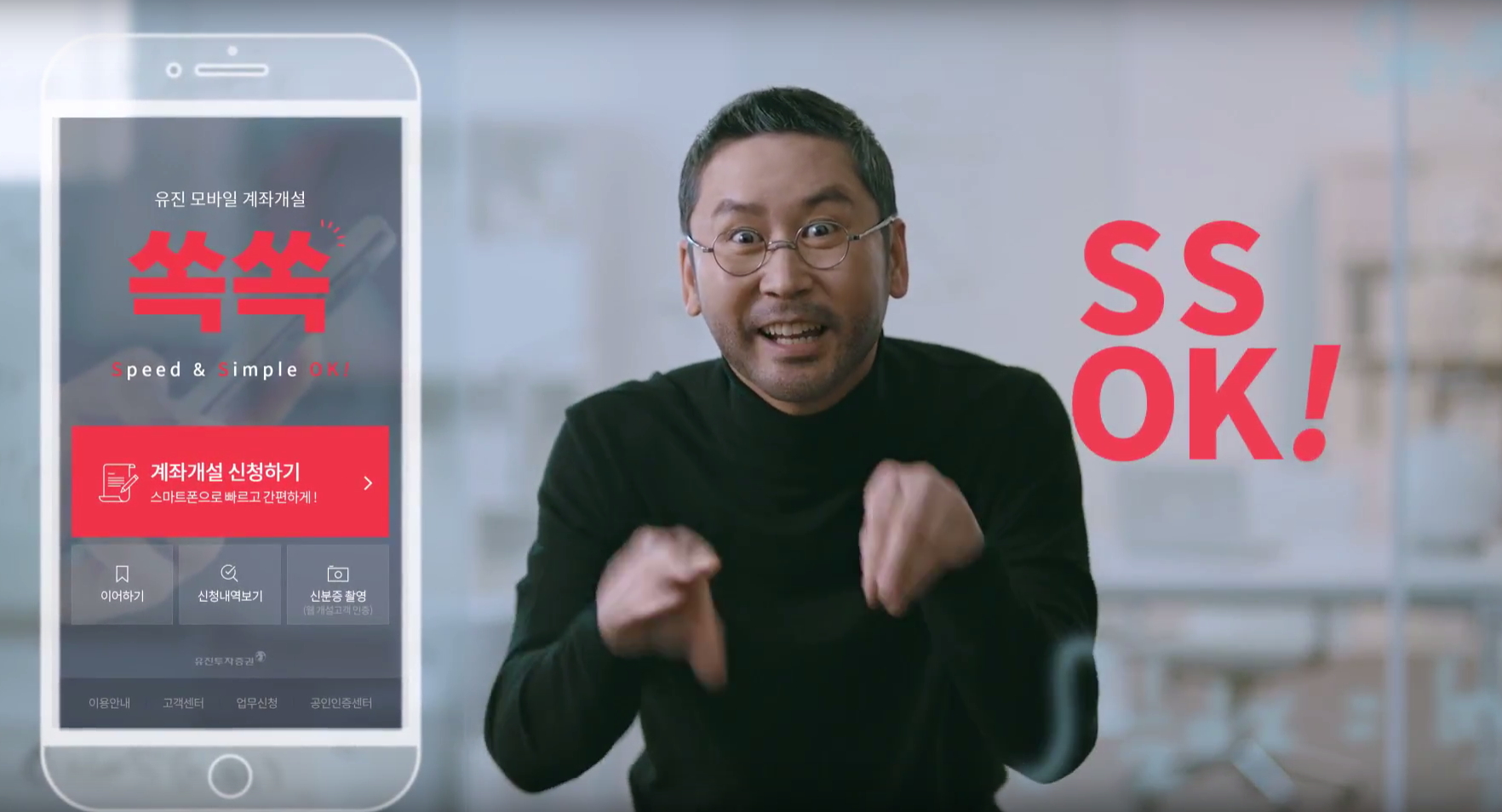 유진투자증권이 비대면 모바일 계좌개설 '쏙쏙'(Speed & Simple OK!, SSOK!의 약자) 브랜드를 출시하고 개그맨 신동엽을 CF모델로 발탁, TV광고를 송출 중이다. TV 광고 속 신동엽은 스티브잡스를 패러디한 '스티브엽스' 캐릭터로 분해 비대면 모바일 계좌개설 '쏙쏙'브랜드를 설명하는 내용을 담고 있다.