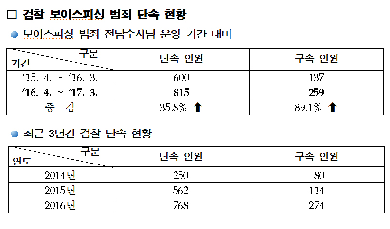 검찰은 지난해 4월 일선 청 강력부를 중심으로 보이스피싱 범죄 전담수사팀을 편성해 1년 간 집중 단속을 벌였다. 안산지청의 경우 3000여 명의 피해자들로부터 54억여 원을 가로챈 보이스피싱 조직을 적발해 44명을 구속했다. 구속된 총책은 1심에서 징역 20년의 중형을 선고받았다. 대전지검도 24개 유령법인을 설립하고 대포통장 76개를 넘긴 폭력조직을 적발해 6명을 구속했다. 검찰은 전국 18개 지검에 설치된 보이스피싱 범죄 전담 수사팀을 중심으로 단속을 지속적으로 추진하는 한편 공판 과정에서도 중형을 구형할 예정이다.