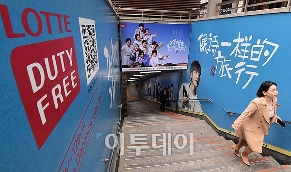 중국의 사드(고고도미사일방어체계)보복조치가 시작된 지난달 한국을 찾는 외국인 규모가 감소했다. 한국관광공사에 따르면 지난 3월 중국인 관광객은 전년 동기보다 40.0% 감소했으며 방한 외국인 관광객은 11.2% 줄었다. 25일 중국어로 된 광고가 설치된 서울 명동 지하상가 입구가 한산하다. 고이란 기자 photoeran@