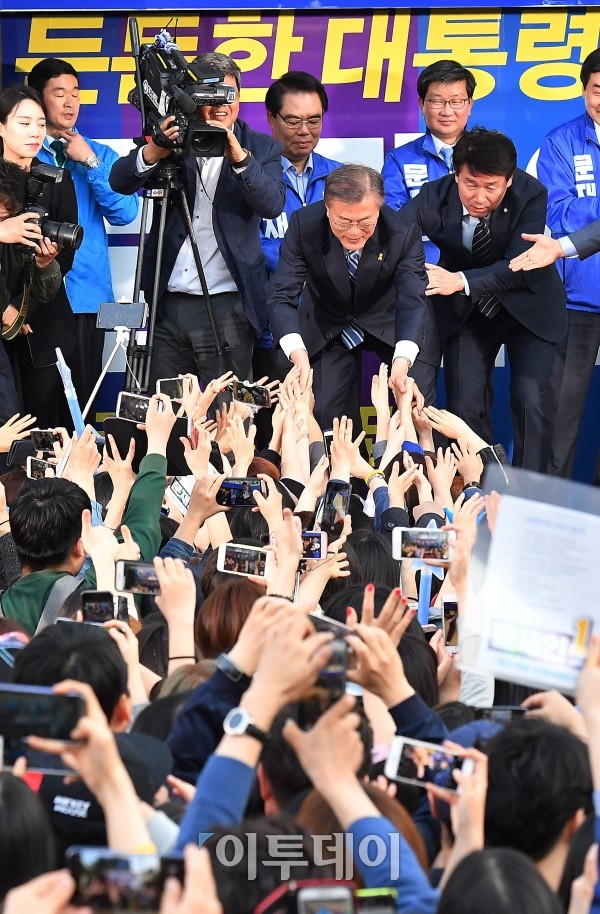더불어민주당 문재인 대선후보가 27일 경기 성남시 야탑역 광장에서 거리유세를 펼치며 시민들과 악수하고 있다. 이동근 기자 foto@