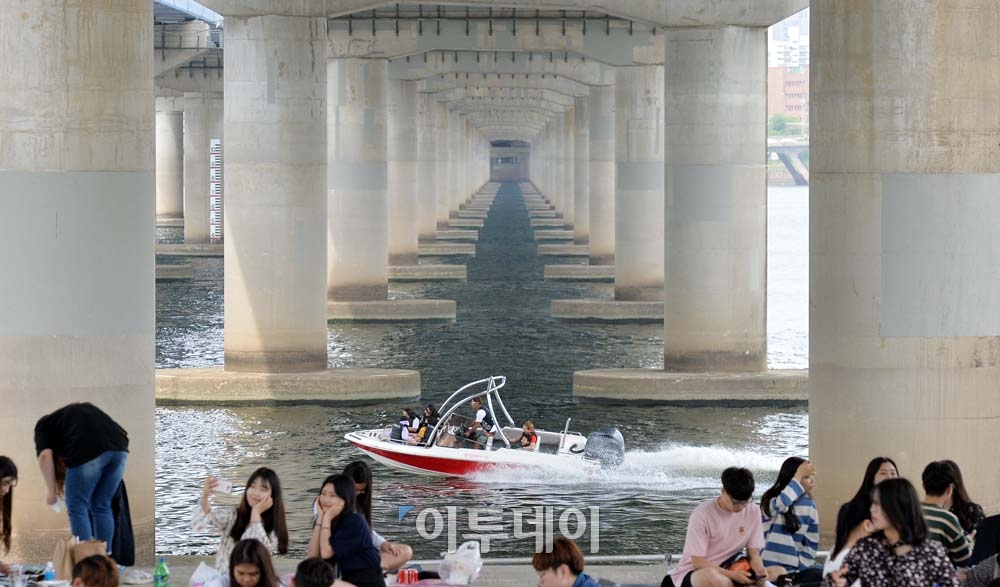 초여름 날씨를 보인 4일 서울 한강에서 보트를 탄 시민들이 바람을 맞으며 더위를 식히고 있다. 최유진 기자 strongman55@