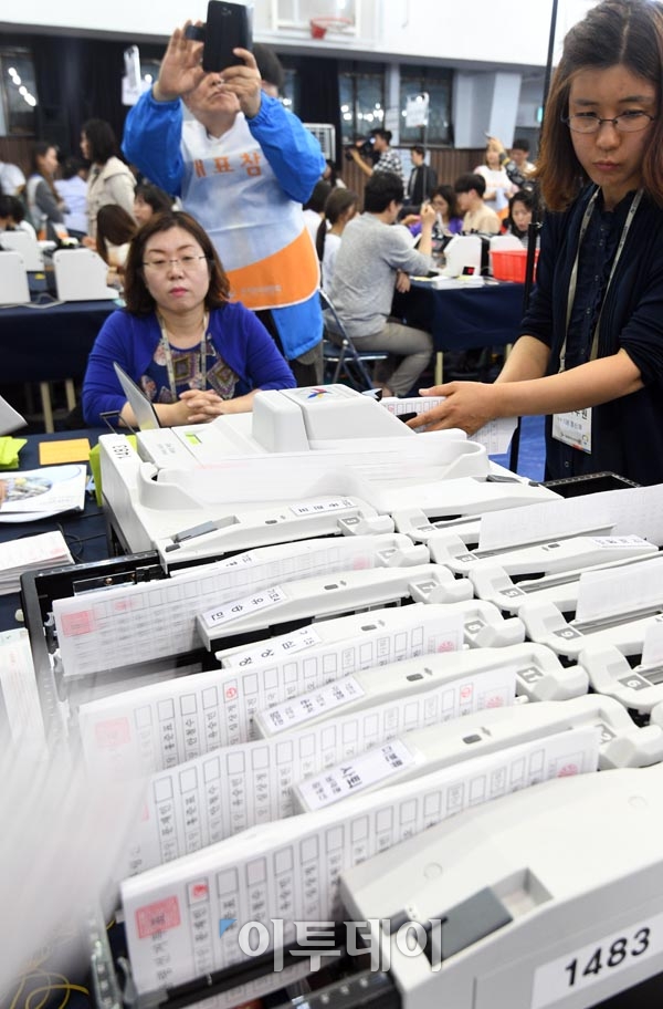 제19대 대통령선거 개표가 시작된 9일 오후 서울 영등포구 여의도고등학교에 마련된 개표소에서 개표가 진행되고 있다. 최유진 기자 strongman55@