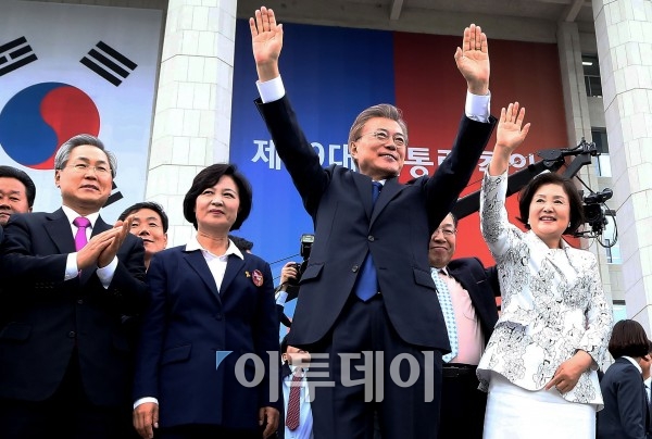 문재인 대통령 내외가 10일 서울 여의도 국회에서 열린 취임식을 마친 후 본청을 나와 밖에서 기다리던 국민들을 향해 인사하고 있다. 국회사진취재단