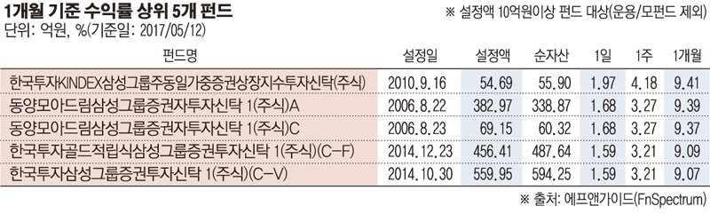 펀드평가회사 에프앤가이드에 따르면 지난 12일 기준 운용설정액 10억 원 이상인 삼성그룹주 펀드 44개의 1개월 평균 수익률은 7.96%로 나타났다. 운용설정액은 운용 펀드에 속한 개별 클래스의 설정액을 전부 합친 금액이다.