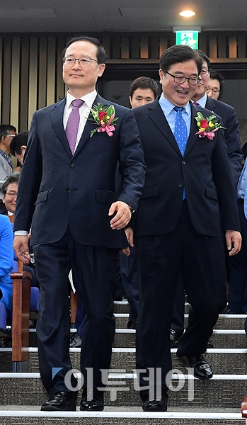 더불어민주당 원내대표 선거에 출마한 홍영표(왼쪽), 우원식 의원이 16일 오전 서울 여의도 국회에서 열린 2기 원내대표 선거에 입장하고 있다. 고이란 기자 photoeran@