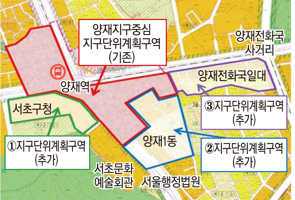 재정비 용역에는 △강남대로·남부순환로가 인접하고 지하철 3호선과 신분당선이 교차하는 양재역 주변 기능 재검토 △공공업무시설과 문화·주거·상업 시설이 공존하는 서초구청사 복합개발계획 △양재역 주변 업무·상업 기능 강화 등의 내용을 담았다.