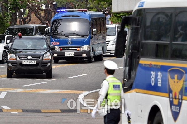 박근혜 전 대통령의 첫 재판이 열리는 23일 오전 박 전 대통령이 탄 호송차량이 서울중앙지방법원으로 들어서고 있다. 이동근 기자 foto@