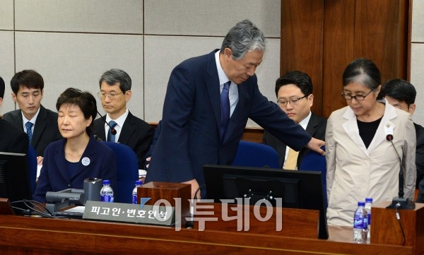 삼성 등 대기업으로부터 총 592억 원의 뇌물수수 혐의로 구속기소된 박근혜 전 대통령(왼쪽)과 국정농단의 주범으로 지목된 최순실씨가 23일 서울 서초구 서울중앙지법에서 열린 1차 공판에 출석해 피고인석에 자리하고 있다. 사진공동취재단