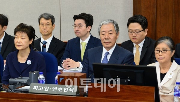 삼성 등 대기업으로부터 총 592억 원의 뇌물수수 혐의로 구속기소된 박근혜 전 대통령(왼쪽)과 국정농단의 주범으로 지목된 최순실씨가 23일 서울 서초구 서울중앙지법에서 열린 1차 공판에 출석해 피고인석에 자리하고 있다. 사진공동취재단