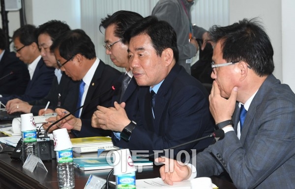 김진표 국정기획자문위원장(오른쪽에서 두번째)이 24일 오전 서울 종로구 국정기획자문위원회에서 열린 기재부 업무보고에서 모두발언을 하고 있다. 이동근 기자 foto@