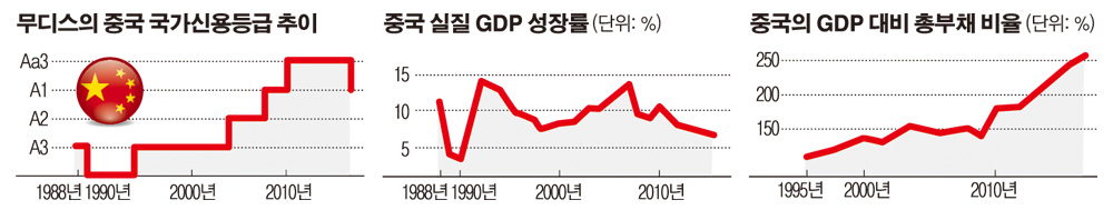 앞서 무디스는 24일 중국의 국가신용등급을 종전 ‘Aa3’에서 ‘A1’으로 한 단계 강등했다. 경제 성장세 약화로 경제 전반에 부채가 실질적으로 증가해 정부 재정 건전성이 다소 악화할 수 있다는 이유에서였다. Aa3 등급은 무디스 신용평가 체계 중 위에서 다섯 번째 등급이다. 현재 한국의 신용등급(Aa2)보다는 두 단계 아래다. 전문가들은 무디스가 시진핑 중국 국가주석 등 지도부가 부채 문제를 통제하면서도 현재의 경제성장 속도를 유지할 수 있을지 의문을 제기한 것이라고 풀이했다.