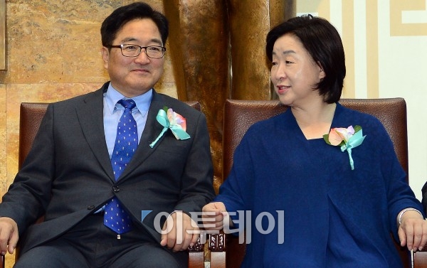 정의당 심상정 공동대표(오른쪽)와 더불어민주당 우원식 원내대표가 31일 서울 여의도 국회에서 열린 제69주년 국회개원기념식에서 대화하고 있다. 이동근 기자 foto@