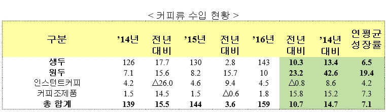 관세청은 커피 제품의 다양화ㆍ고급화, 해외 직접소싱, 다양한 커피전문점 증가 등이 생두 수입 증가로 이어지고 있는 것으로 분석했다.
