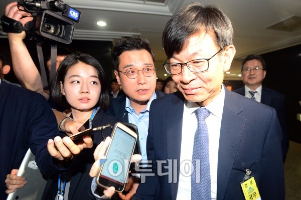 김상조 공정거래위원장 후보자가 2일 오전 인사청문회를 앞두고 서울 여의도 국회로 들어서며 취재진의 질문을 받고 있다. 이동근 기자 foto@