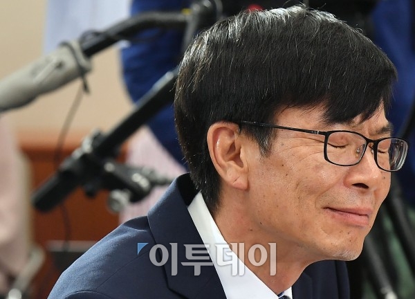 김상조 공정거래위원장 후보자가 2일 오전 서울 여의도 국회에서 열린 인사청문회에서 청문위원의 질의를 들으며 눈을 감고 있다. 이동근 기자 foto@